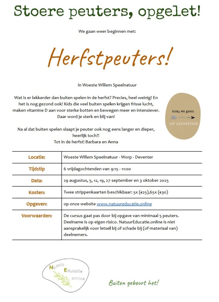 We gaan dit najaar 2025 weer van start met Herfstpeuters in Woeste Willem, te Deventer